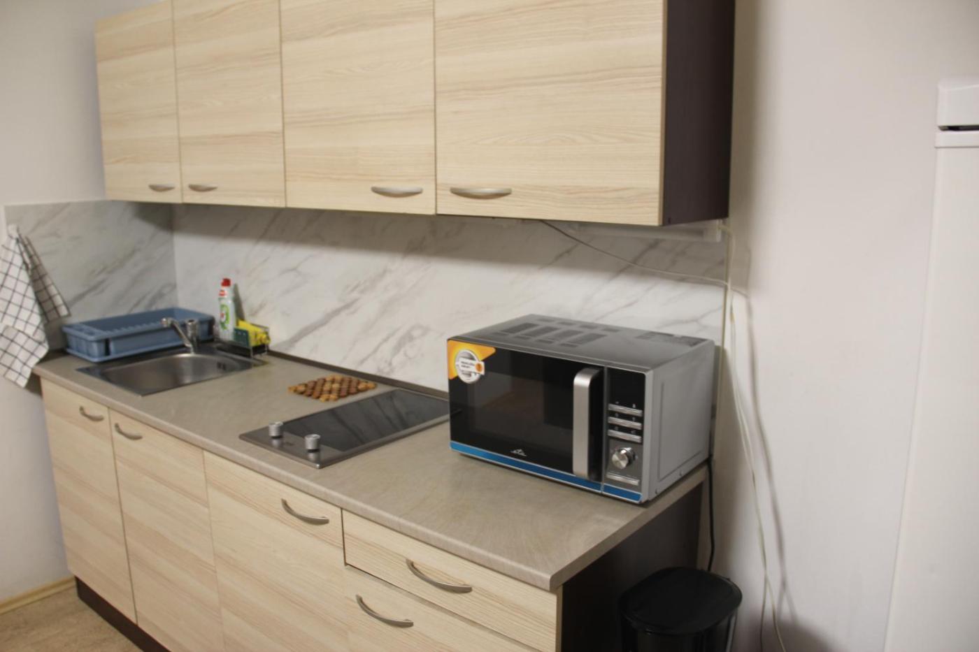 One-Bedroom Apartment. Boasting a private entrance, this apartment features 1 living room, 1 separate bedroom and 1 bathroom with a bath and a shower. Guests can make meals in the kitchen that has a stovetop, a refrigerator, kitchenware and a microwave. The apartment features a washing machine, soundproof walls, a tea and coffee maker, a flat-screen TV with satellite channels, as well as city views. The unit has 3 beds.