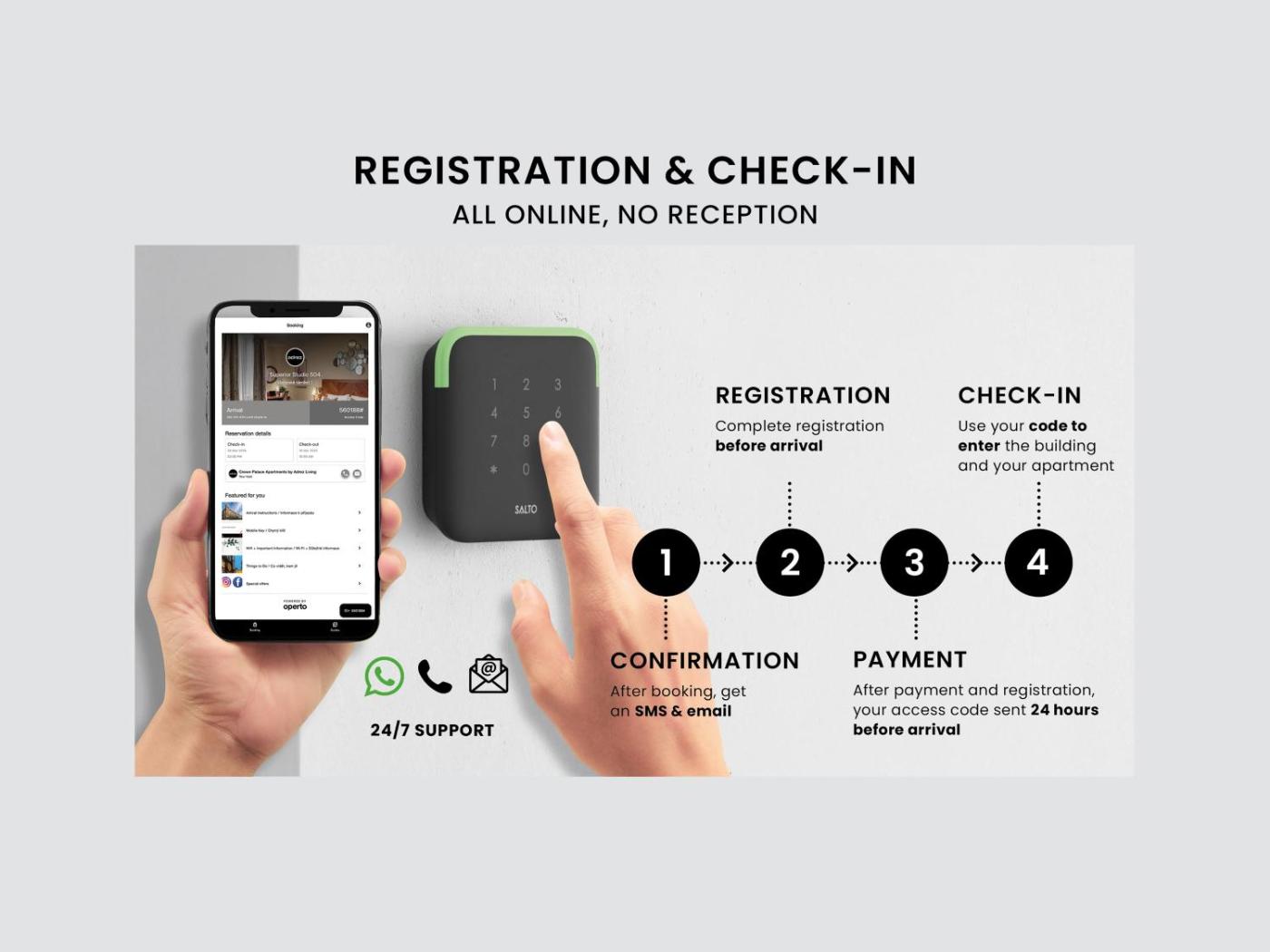These apartments are fully online with no Reception. You will receive a link to fill in personal details forin your reservation then receive a code for the apartment after payment. The alternative is to visit our central Reception at the Hotel "Palác U Kočků" (Palace At the Cats). For transport needs please contact us on booking@pragueresidences.com. Telephone contact to our Reservations team is +420 222 743 781